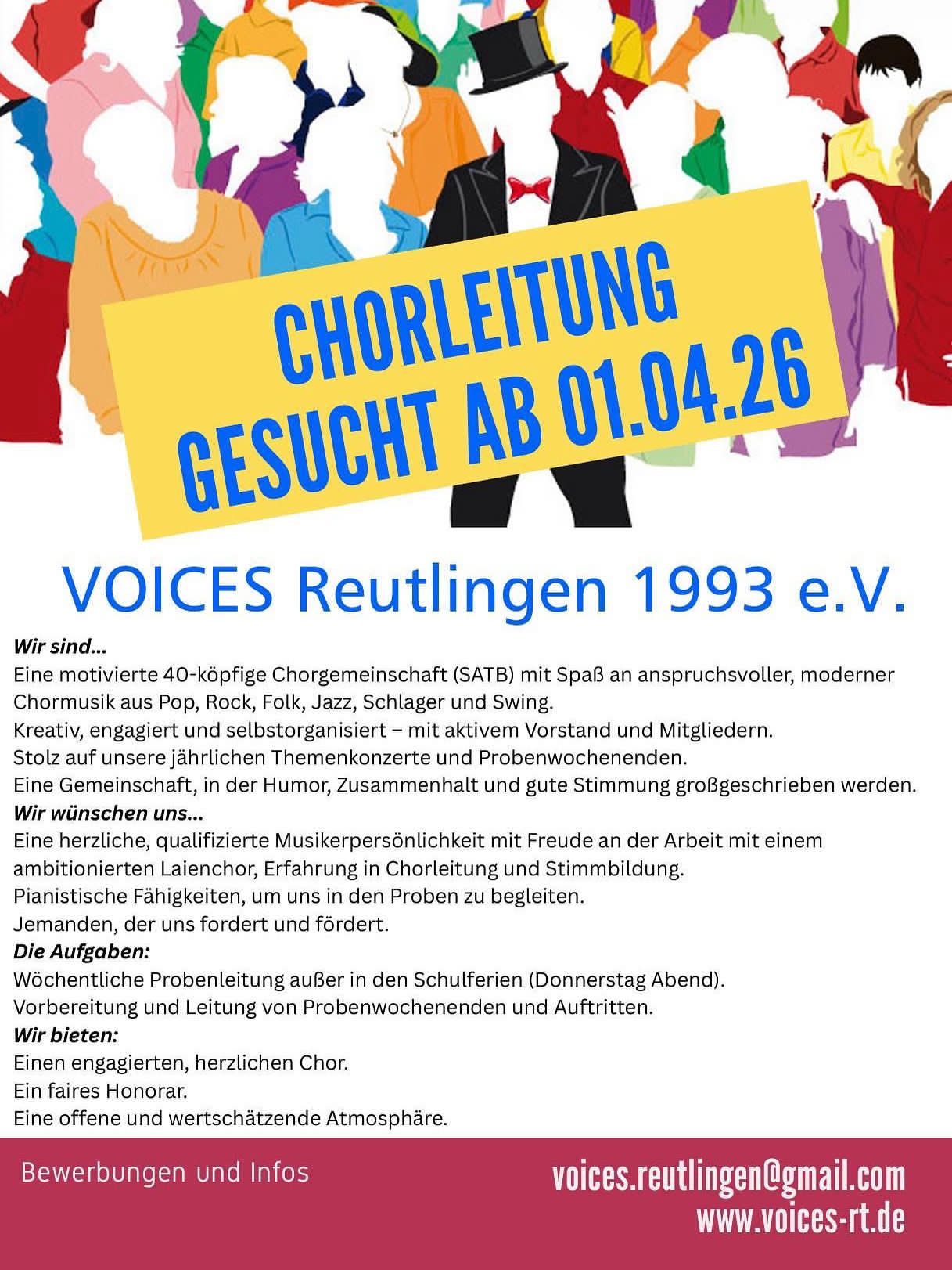 haben uns 1993 in Reutlingen zusammengefunden, um moderne Chormusik auf die Bühne zu bringen. Unser Repertoire umfasst Titel aus den Bereichen Blues, Folk, Jazz, Pop, Rock, Schlager, Swing.